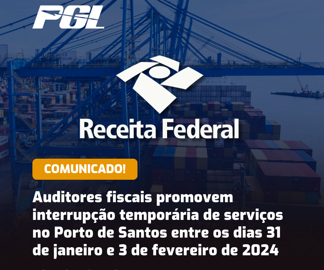 Do dia 31 de janeiro ao dia 03 de fevereiro de 2024, os Auditores Fiscais não farão atendimento ao público, desembaraço aduaneiro ou qualquer atividade no setor da Alfândega do Porto de Santos.