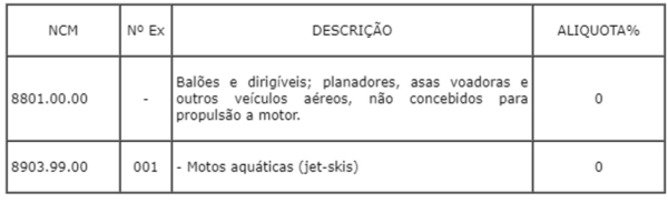 O imposto de importação de Jet-Ski, balão e dirigíveis foi reduzido a zero