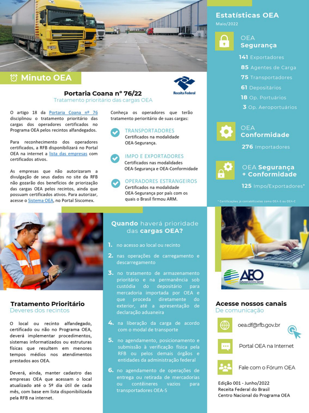 Em 17/05/2022 foi publicado a portaria COANA 76 que, além de disciplinar as especificações técnicas e as condições relativas às aéreas segregadas nos recintos alfandegados (terminais e aeroportos), trás também o tratamento prioritário para as cargas das empresas OEA.